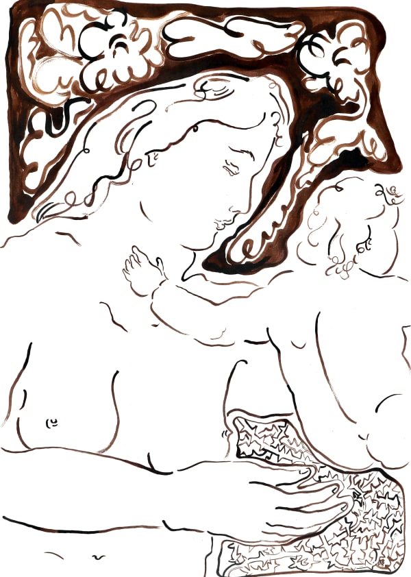 Ruby Bateman is a visual artist, working and living in Hackney, London. Her work is often self-referential, (re)depicting and translating imagery across different materials and processes: her sculptures appearing in her paintings, her paintings appearing in her drawings, and so forth. Ruby investigates her personal and political identification with 'the mother' and (institutionalised) motherhood with a richly colourful and symbolic visual language, referencing her own fiction. By exploring her ambivalence for motherhood, which love and loss has led her to desire, she continues to develop a deeper maternal consciousness